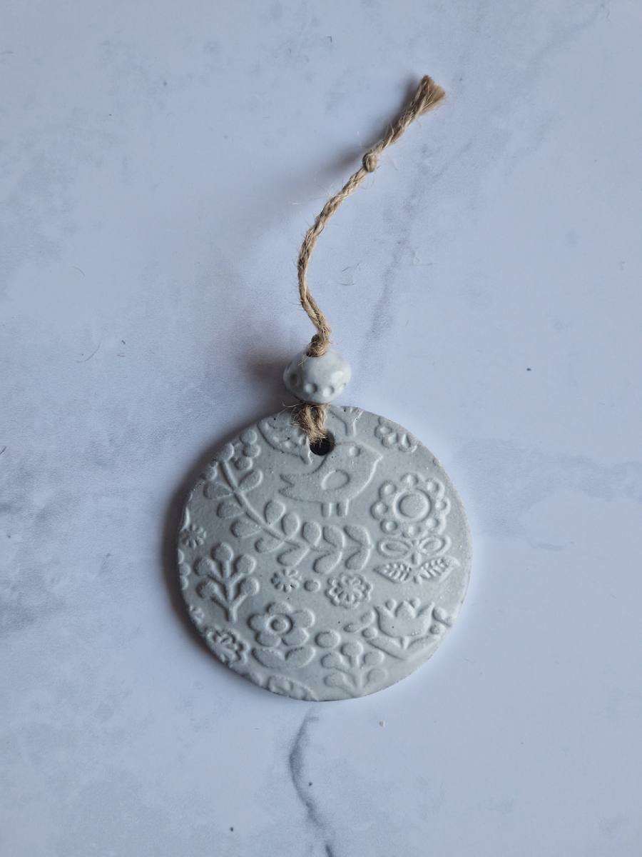 Apportez une touche de poésie dans votre intérieur avec ce médaillon aux motifs floraux, agrémenté d’une perle unique modelée à la main.